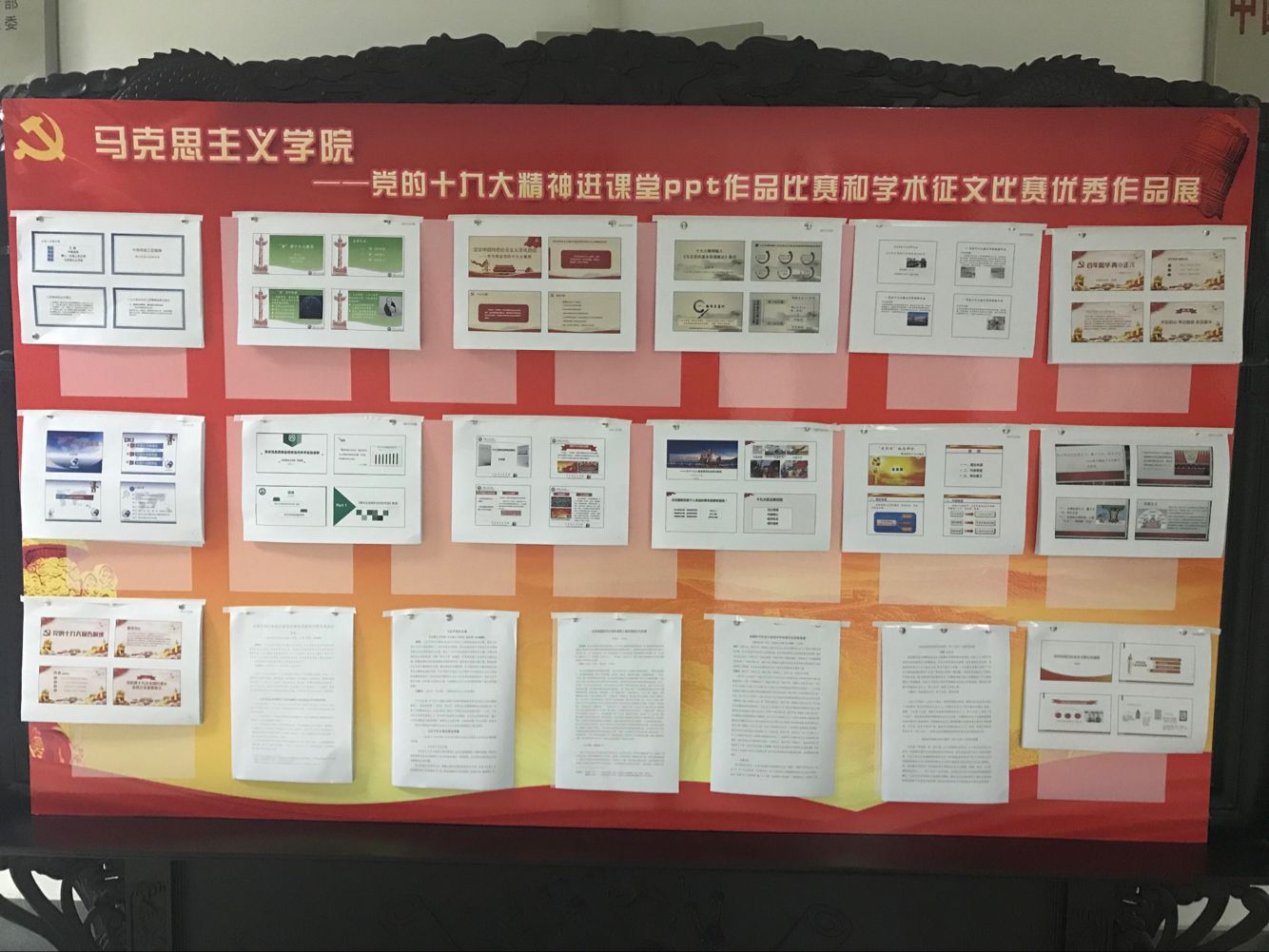 为深入学习贯彻党的十九大精神,推进十九大精神“进课堂、进教材、进学生头脑”工作,引导广大师生为实现党的十九大提出的宏伟目标而努力奋斗,2017年11月28日——12月18日,马克思主义学院党委面向广大师生举办了“党的十九大精神进课堂”PPT作品比赛和学习党的十九大精神学术征文比赛。