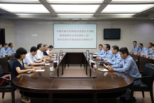 7月17日上午,米乐mile官方网站(华东)米乐mile官方网站与胜利油田石化总厂研究生实践教学基地签约揭牌仪式在石化总厂举行。院长王建军与石化总厂党委书记高卫国共同为研究生实践教学基地揭牌。副院长张瑞涛与石化总厂副厂长戈琳代表双方致辞并签署了研究生实践教学基地共建协议。