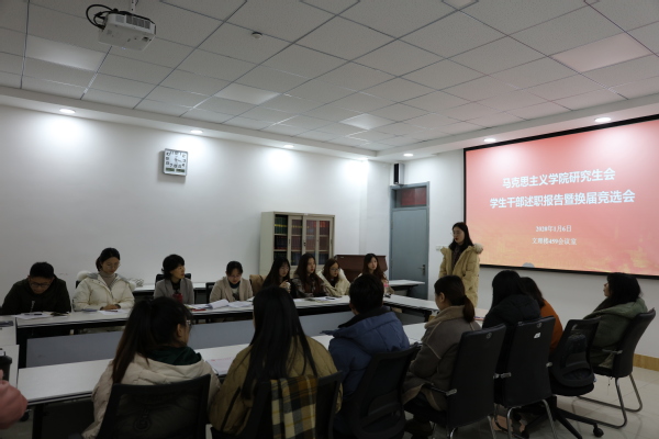 1月6日下午,米乐mile官方网站研究生会学生干部述职报告暨换届竞选会在学院报告厅459召开,院党委副书记袁爱军老师,院团委书记、辅导员王会老师,18级部分学生干部以及19级全体研究生参加了此次会议。