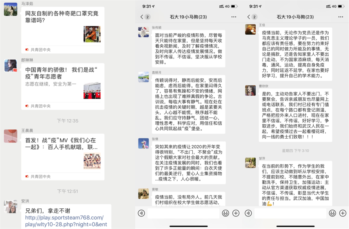 组织院研究生会在网络上发出马院学子的声音。2月4日,院研究生会策划了《心系武汉,马院学子为你们加油!》主题微信推文。米乐官网来自四川、内蒙古、北京、河北、陕西、贵州等山东省外学子和来自青岛、济南、寿光等地的山东省内学子在自己所在的省份和城市为武汉加油。院研究生会宣传部制作了相关视频,展现了米乐官网青年学子的青春气息和高度的正能量。同时,号召米乐官网在网络上积极发生,弘扬主旋律和正能量,以高度的责任感和使命感维护风清气正的网络空间。来自寿光市的2018级硕士研究生李雪莹说道:“大年初四早上一出门就看到一辆辆运输蔬菜的车整齐有序的行驶在宽阔的马路上,中午就看到了山东寿光向武汉捐赠350多吨的新闻,想到18、19年山东寿光发生水灾的时候武汉也是第一时间伸出援手,瞬间有些泪目,一方有难,八方支援!经历过特大水灾的寿光人不会忘记当初伸出援手的你们,武汉加油!中国加油!”米乐官网习近平新时代中国特色社会主义思想青年研习会负责人积极传播党中央、国务院的相关疫情防控部署信息,提高青年学子的政治站位和理论素养,发挥了思想理论类社团在网络空间的思想引领作用。