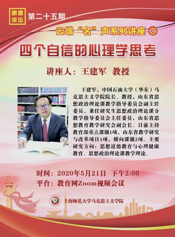 5月21日下午,院长王建军教授应上海师范大学米乐mile官方网站的邀请为学院研究生作了题为“四个自信”的心理学思考的线上讲座。