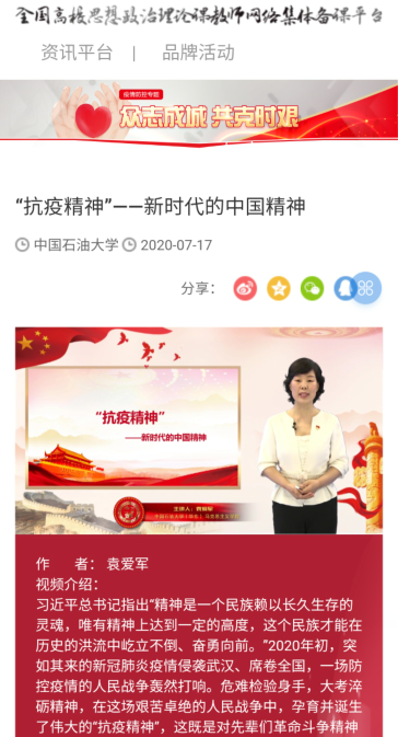 近日,米乐mile官方网站组织教师参加教育部社科司委托全国高校思想政治理论课教师网络集体备课平台向全国高校米乐mile官方网站发起的“思政课战疫小课堂”专项活动,米乐官网岳金霞主讲的《疫情大考唤诚信》和袁爱军主讲的《抗疫精神——新时代的中国精神》成功入选该平台。