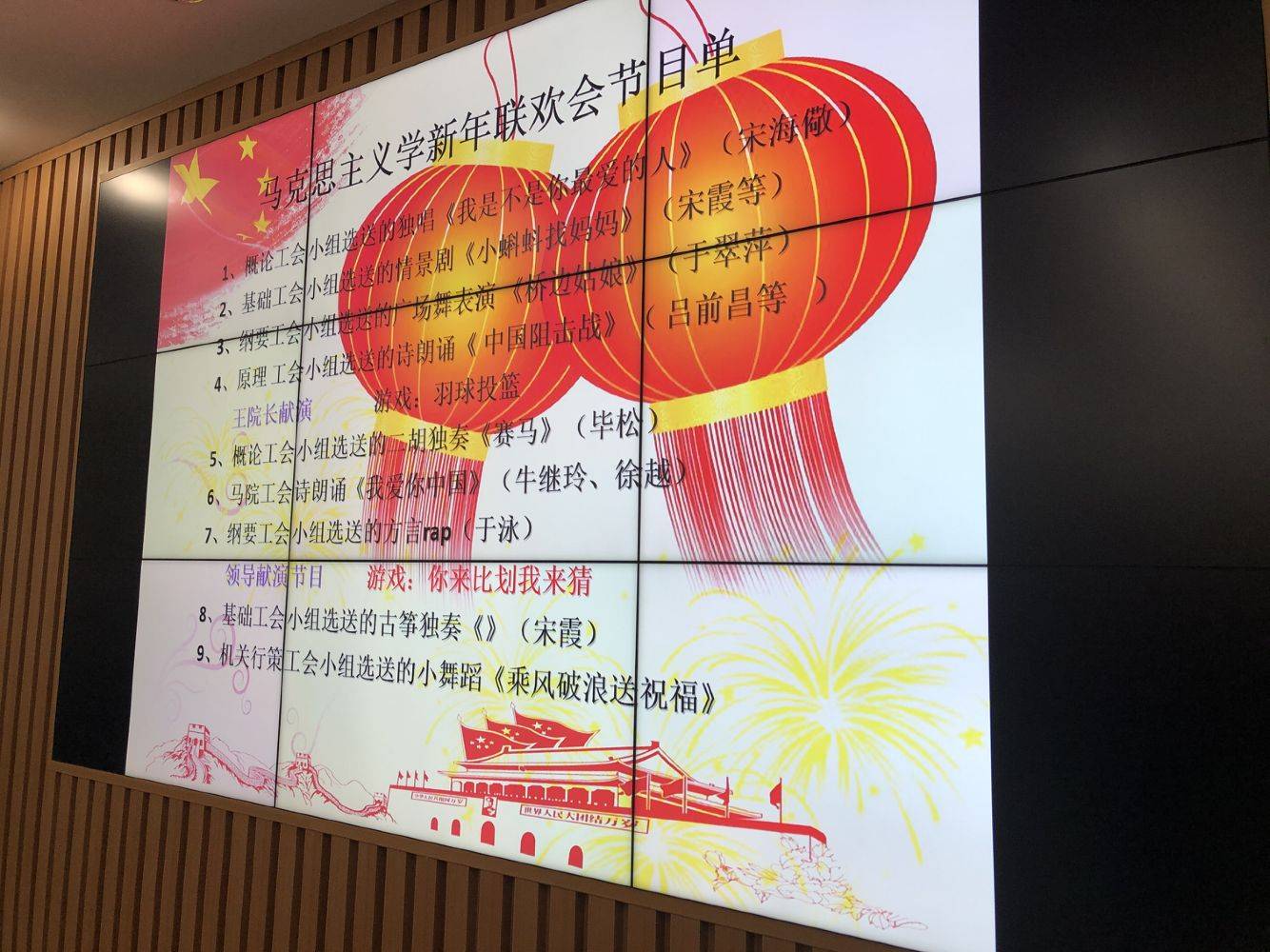 “玉鼠回宫传捷报,金牛奋蹄涌春潮!”2021年1月8号下午,米乐mile官方网站工会举行2021年迎新联欢会。马院的老师们各显神通,节目丰富多彩,形式多样,既有歌舞表演,又有人人可以参与的游戏节目。联欢会主题鲜明,歌颂中华民族的爱国主义精神,歌颂我们团结一心阻击疫情的抗疫精神,彰显马院红色文化内涵。