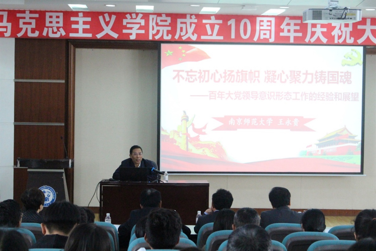 同时,作为米乐mile官方网站成立10周年庆祝活动的组成部分,学院邀请了南京师范大学教授、“长江学者”王永贵教授作了题为“不忘初心扬旗帜 凝心聚力铸国魂——百年大党领导意识形态工作的经验和展望”的学术报告。