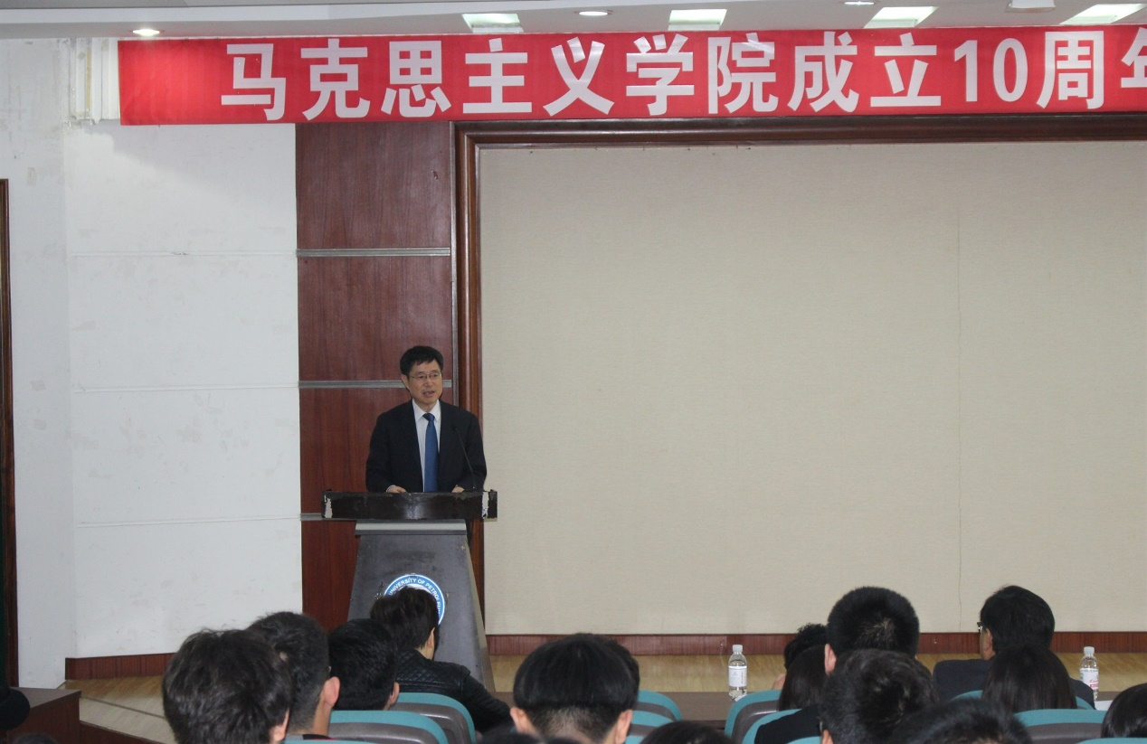 米乐mile官方网站(华东)党委副书记万云波代表学校讲话。在讲话中,万云波副书记充分肯定了米乐mile官方网站建院10年来,在思政课教学、学科建设、人才建设、科学研究、队伍建设、党的建设和社会服务等方面取得的丰硕成果。在新的历史起点上,他向学院提出三点希望:一是进一步凝练学科方向,汇聚研究资源,建设特色鲜明的国内一流马克思主义研究高地;二是推动思想政治理论课改革创新,不断增强思政课的思想性、理论性和亲和力、针对性,切实提升思政育人的实效;三是巩固马克思主义在学校意识形态领域的指导地位,切实推动马克思主义进校园、进课堂、进学生头脑,努力在马克思主义理论阐释,宣传和守正创新等方面取得新的突破。