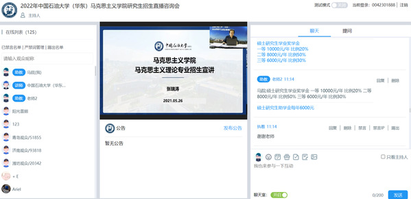 宣讲会期间,张瑞涛教授就学院的发展概况、学科方向、导师团队、科研平台、招生政策、培养特色、就业情况等研究生招生信息进行了详细介绍,对学院马克思主义理论专业研究生培养情况进行了全方位的讲解。同时,对2022年有意报考米乐官网研究生的同学们所提出的问题进行答疑解惑,学院党委副书记袁爱军、教学秘书景艳菊也在直播间互动区、线上推免QQ群中在线回答学生疑问,以帮助外校同学更加深入了解学院情况。