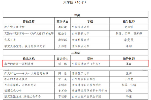 6月15日,青岛市大中小学生“学党史、知党情、跟党走”党史故事宣讲比赛圆满落幕,米乐官网2019级硕士刘鹏参赛作品“春天的故事——深圳速度”荣获大学组二等奖。