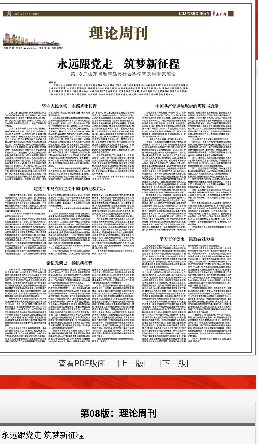 6月8日,《青岛日报》刊登了米乐官网司江伟教授在第18届山东省暨青岛市社会科学普及周专家笔谈专栏发表的《坚守人民立场 永葆基业长青》一文。文章认为在100年的伟大征程中,中国共产党始终坚守人民立场,铸就了卓越的百年辉煌。文章从三个方面做了论述。首先,人民立场是马克思主义政党的本质属性。马克思站在人民立场上开启了理论的创建,并将人民立场贯穿于马克思主义的全部理论和实践。以马克思主义为指导思想建立起来的中国共产党,自诞生之时就必然地秉持了人民立场,确立了自身独特的理想信念与价值追求。其次,人民立场是党的事业取得成功的基本经验。在28年艰苦卓绝的革命斗争中,中国共产党始终坚持为人民求解放。经过“三大改造”,建立了人民当家作主的社会主义制度。改革开放以来,中国共产党始终坚持为人民谋幸福。一切为了人民、一切依靠人民的高远追求,由此取得了举世瞩目的伟大成就。最后,人民立场是党的基业永葆长青的力量源泉。以习近平同志为核心的党中央明确提出了以人民为中心的发展思想,阐明了中国共产党新时代的执政理念。要坚守人民立场,就必须坚持党的领导与坚持人民主体地位有机统一,必须维护并发展好人民群众的根本利益,着力保障和改善民生,还必须勇于自我革命,以党的先进性与纯洁性持续赢得民心。