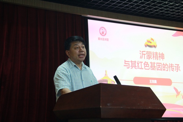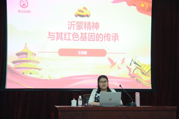 王克霞从形成背景、内涵及特征三个方面详细解读了沂蒙精神。沂蒙精神根植于中华民族优秀的文化传统,诞生于战火纷飞的抗日战争时期,升华于解放战争年代,发展于改革开放新时期,是山东人民在中国共产党的正确领导下,逐步砥砺淬炼的具有浓郁地方色彩的精神瑰宝。在长期的革命、建设和改革实践中,沂蒙精神逐渐形成了“爱党爱军、开拓奋进、艰苦创业、无私奉献”的内涵。在报告最后,王老师指出,沂蒙精神虽然产生和发展于沂蒙老区,但它并不仅仅属于沂蒙;沂蒙精神虽然孕育和诞生于战争年代,但它并不仅仅代表过去;沂蒙精神是理论的,更是实践的,而且是源于实践高于实践的;沂蒙精神是临沂的,也是山东的,更是中国的。要结合新时代要求不断弘扬沂蒙精神,为中华民族的伟大复兴提供精神动力。