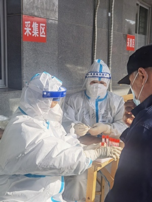 (米乐官网院长张瑞涛老师身着防护服,参与核酸采样志愿服务)