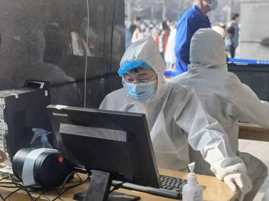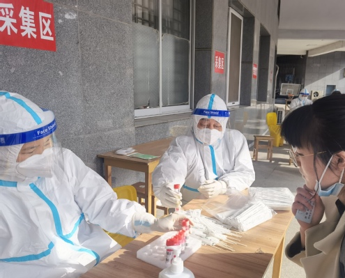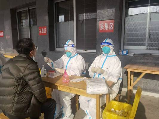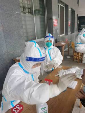 (3月24日米乐官网教师党员周国瑞老师、宋霞老师作为志愿者,在抗疫一线进行核酸检测工作)