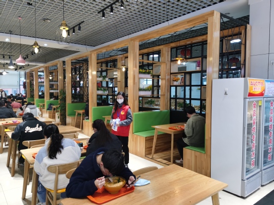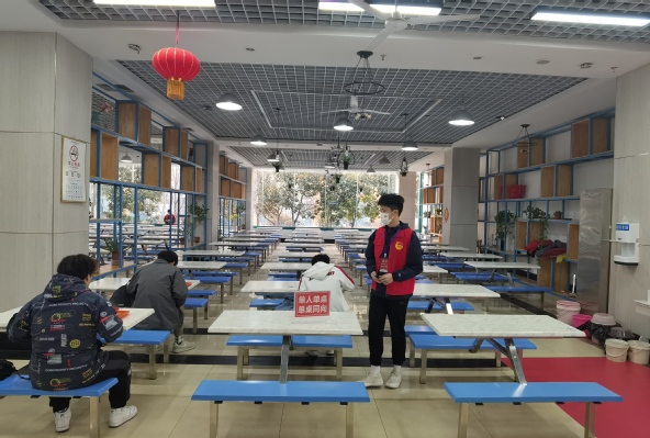 (学生党员赵丽燕同学、学生入党积极分子颜优同学作为志愿者在玉兰苑餐厅引导同学们有序就餐)