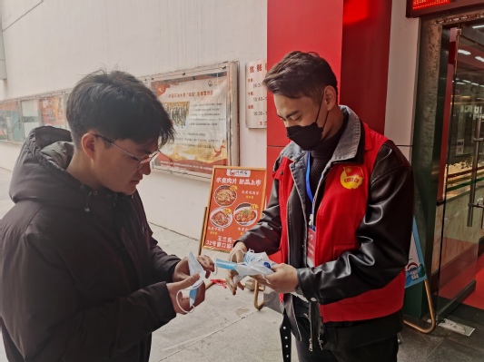 (学生党员刘琦同学、朱敏同学作为志愿者在玉兰苑餐厅向同学分发口罩)