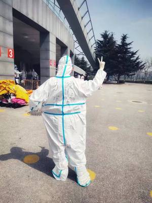 (3月24日米乐官网教师党员宋霞老师身着防护服,为同志们加油打气)