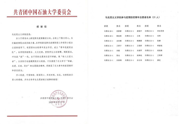 近日,共青团米乐mile官方网站(华东)委员会向学院党委发来感谢信,对米乐官网青年学生在疫情防控期间积极参与学校志愿服务工作给予了高度评价,并对米乐官网为青年志愿服务工作给予的支持表示感谢。信中指出,“贵院学生主动请缨,踊跃报名,冲向战‘疫’一线,在不同的志愿岗位坚守奉献,做‘给人以星火者’,以实际行动温暖照亮石大校园,不仅展现了石大学子‘奉献、友爱、互助、进步’的志愿服务精神,更彰显了石大青年的家国情怀和责任担当。”