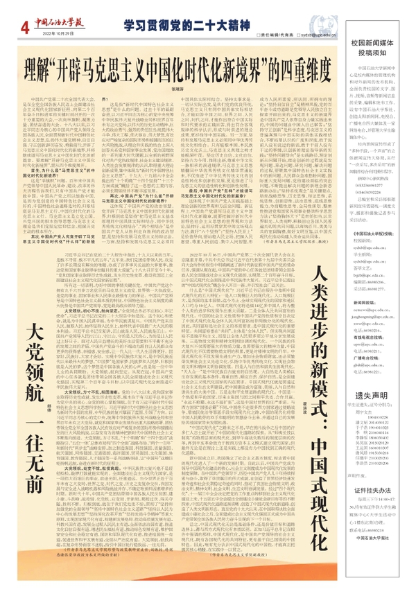 学院院长张瑞涛教授的文章《理解“开辟马克思主义中国化时代化新境界”的四重维度》,从“为什么是‘马克思主义’的中国化时代化新境界?”“中国共产党人究竟开辟了马克思主义中国化时代化‘什么样’的新境界?”“中国共产党‘为什么能’开辟马克思主义中国化时代化的新境界?”“中国共产党‘怎样’才能谱写马克思主义中国化时代化的新篇章?”四个维度对理解“开辟马克思主义中国化时代化新境界”进行了阐释。