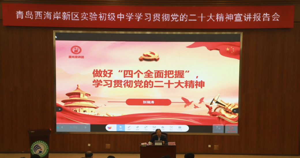 11月14日,米乐官网院长、教师“星光”宣讲团成员张瑞涛教授在青岛西海岸新区实验初级中学,面向全体师生作题为《做好“四个全面把握”,学习贯彻党的二十大精神》的宣讲报告。