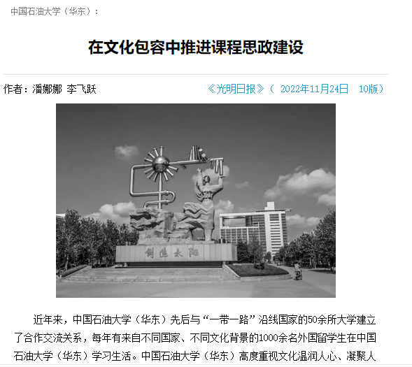 2022年11月24日,《光明日报》刊发米乐官网潘娜娜教授和李飞跃博士联合撰写的研究成果《在文化包容中推进课程思政建设》。该文从以包容文化涵养课程思政的校园氛围、以包容文化丰富课程思政的上下形式和以包容文化拓宽课程思政的内外渠道三个方面全面系统地介绍了我校课程思政建设的格局、特色和效果,体现了在我校在课程思政中高度重视文化温润人心、凝聚人心的力量。