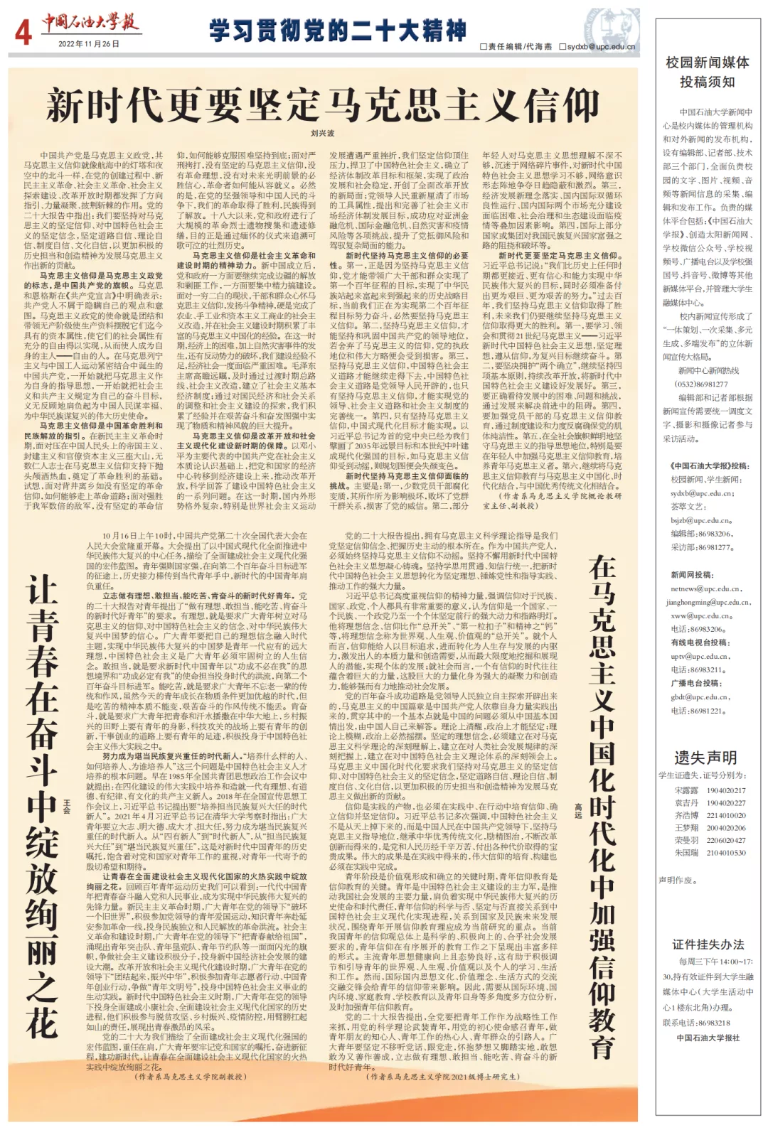 2021级博士研究生高远的文章《在马克思主义中国化时代化中加强信仰教育》认为,马克思主义中国化时代化要求我们坚持对马克思主义的坚定信仰、对中国特色社会主义的坚定信念;信仰是实践的产物,也必须在实践中、在行动中培育信仰、确立信仰并坚定信仰;青年阶段是价值观形成和确立的关键时期,青年信仰教育是信仰教育的关键。