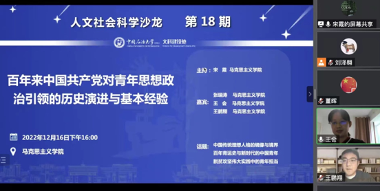 12月16日下午,由学校文科处主办,米乐mile官方网站承办的人文社会科学青年学者沙龙活动成功举办。本次活动采用腾讯会议线上方式举行,活动主题为“百年来中国共产党对青年思想政治引领的历史演进与基本经验”。活动由形势与政策教研室宋霞老师主持,邀请学院院长张瑞涛教授、团委书记王会副教授和形势与政策教研室教师王鹏翔博士做主题发言,思想政治教育研究方向2021、2022级硕士研究生全程参与。