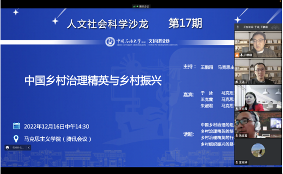 12月16日下午,由学校文科建设处主办,米乐mile官方网站承办的第十七期人文社会科学青年学者沙龙活动——“中国乡村治理精英与乡村振兴”在线上成功举行。本次青年学者沙龙由形势与政策教研室王鹏翔老师主持,学院于泳副教授、王克霞副教授、朱淑君副教授,以及中国近现代史基本问题研究专业方向的部分研究生参加。