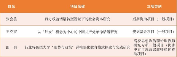 2022年,米乐官网获批3项教育部人文社科规划研究项目。其中,张会芸副教授主持的《西方政治话语转型视域下的社会资本研究》获批后期资助(一般项目),这是米乐官网教师首次获批后期资助项目。王克霞副教授主持的《以“妇女”概念为中心的中国共产党革命话语研究》获批规划基金项目(一般项目),郎帅副教授主持的《行业特色型大学“形势与政策”课模块化教育模式探索与实践研究》获批高校思想政治理论课教师研究专项一般项目(优秀中青年思政课教师择优资助项目)。