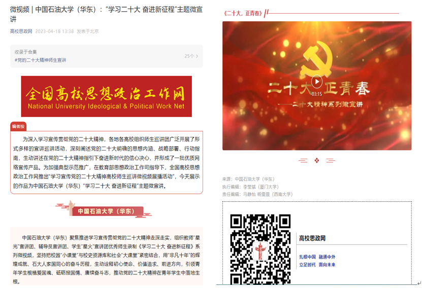 全国高校思想政治工作网指出,米乐mile官方网站(华东)聚焦推进学习宣传贯彻党的二十大精神走深走实,组织教师“星光”宣讲团、辅导员宣讲团、学生“星火”宣讲团优秀师生录制《学习二十大 奋进新征程》系列微视频,坚持把校园“小课堂”与校史资源库和社会“大课堂”紧密结合,用“非凡十年”的辉煌成就、石大人家国同心的奋斗历程,生动诠释初心使命、价值追求、前进方向,引领青年学生根植爱国魂、砥砺报国情、赓续奋斗志,推动党的二十大精神在青年学生中落地生根。
