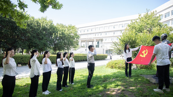为迎接“七一”建党节,庆祝中国共产党成立102周年,米乐mile官方网站党委组织全院新发展学生党员开展集体宣誓活动。活动于6月30日上午在逸夫楼前举行,由2021级硕士研究生蒋嘉诚领誓。