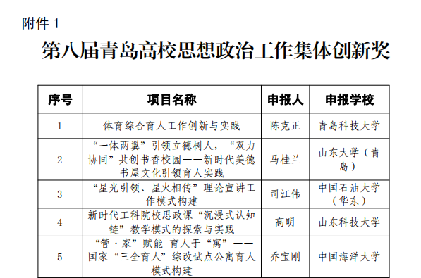 第八届青岛高校思想政治工作创新奖包括集体创新奖项目和个人创新奖项目两类,在2022至2023年度高校思想政治工作中进行的理论、机制、制度、方式方法等有实践成效的创新做法均可按项目的形式上报。根据《中共青岛市委教育工作委员会关于开展第八届青岛高校思想政治工作创新奖评选活动的通知》要求,按照“创新、优质、公平、公正”的原则,经评审委员会综合评审,本届共评选出思想政治工作集体创新奖30项、个人创新奖25项。