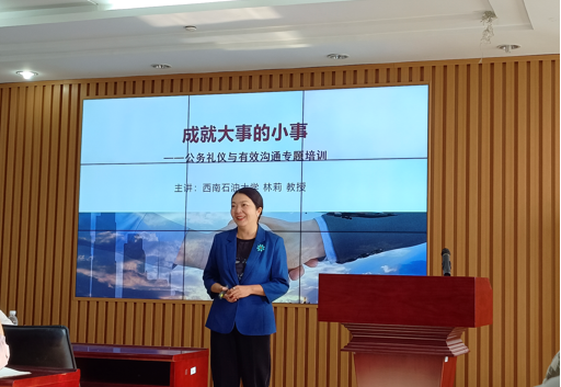 为更好传承中华优秀传统文化,帮助研究生增强沟通能力,培养更具优势的职场能力,10月13日上午,学院在文理楼457顺利举办第三十二期“成长沙龙”活动。本期活动邀请西南石油大学米乐mile官方网站党委副书记、纪委书记林莉教授进行“公务礼仪与有效沟通”专题讲座,活动由学术部刘圣娟主持,学院党委副书记袁爱军、团委书记王会出席,硕士生、博士生参加。