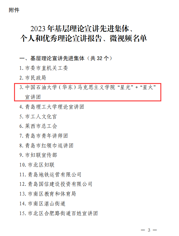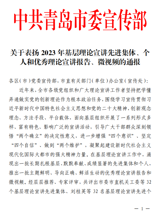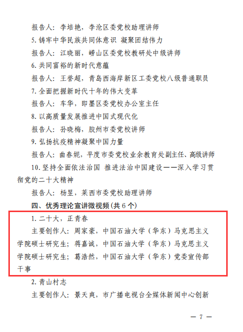 近日,中共青岛市委宣传部印发《关于表扬2023年基层理论宣讲先进集体、个人和优秀理论宣讲报告、微视频的通报》,对32个基层理论宣讲先进集体、32名基层理论宣讲先进个人、10篇优秀理论宣讲报告、6个优秀理论宣讲微视频予以通报表彰。米乐官网“星光”+“星火”宣讲团荣获“基层理论宣讲先进集体”,米乐官网研究生周家豪、蒋嘉诚和校党委宣传部葛浩然老师合作完成的《二十大,正青春》微视频荣获“优秀理论宣讲微视频”。