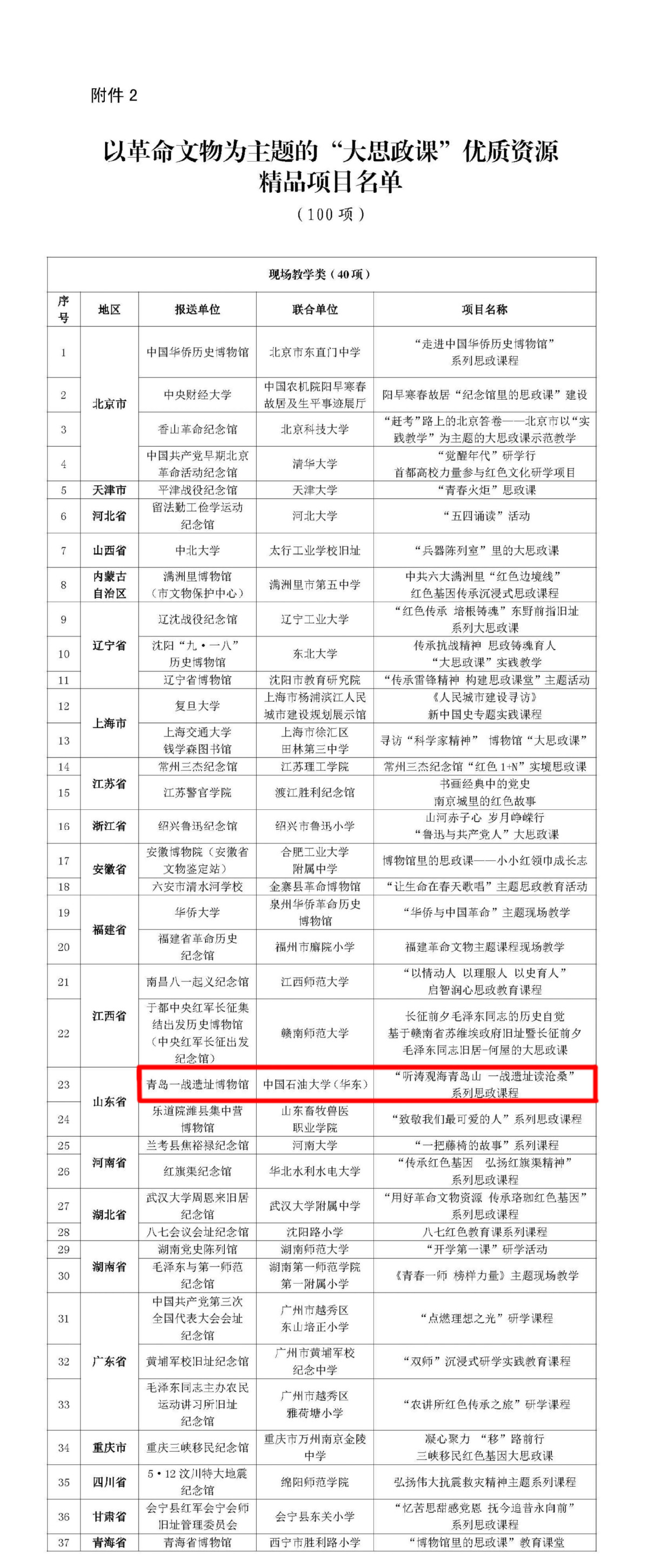 近日,国家文物局办公室、教育部办公厅联合发文公布以革命文物为主题的“大思政课”优质资源项目名单,我校联合青岛一战遗址博物馆打造的项目《“听涛观海青岛山,一战遗址读沧桑”系列思政课程》入选“以革命文物为主题的‘大思政课’优质资源精品项目”。