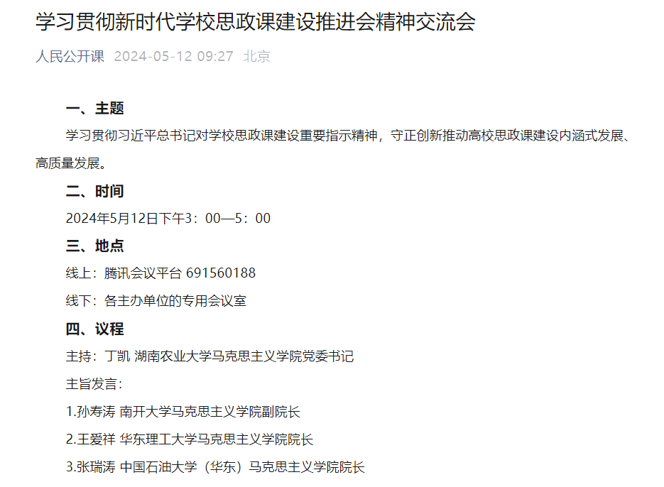 5月12日下午,学院院长张瑞涛在线上参加了学习贯彻新时代学校思政课建设推进会精神交流会并做发言。本次会议由米乐官网与湖南省当代中国马克思主义研究中心湖南农业大学基地、湖南省“大思政课”建设创新中心(湖南农业大学)、湖南教育电视台联合发起,全国高校思政课“手拉手”集体备课中心(南开大学-湖南省)、“大国三农”思政课程与课程思政融合建设与传播基地联合承办。在发言中,张瑞涛院长就如何学习贯彻习近平总书记对学校思政课建设重要指示精神,守正创新推动高校思政课建设内涵式发展、高质量发展等方面发表了意见,并与各高校马院参会人员做了深入交流。