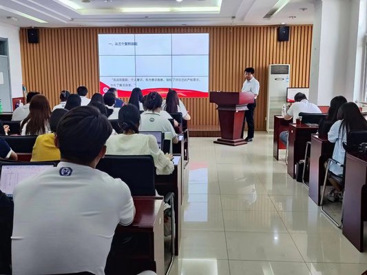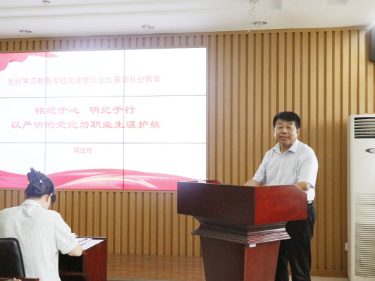 为了引导马院学子牢记初心使命、坚定理想信念、践行党的宗旨,在学习和工作岗位上持续发挥党员的先锋模范作用,6月18日下午,学院在文理楼457开展党纪学习教育专题党课暨毕业生廉洁从业教育。本次党课邀请党委书记司江伟作题为《铭纪于心、明纪于行,以严明的党纪为职业生涯护航》的分享。活动由团委书记王会主持,学院机关党支部全体党员、2021级毕业生和2022级、2023级全体党员参加活动。