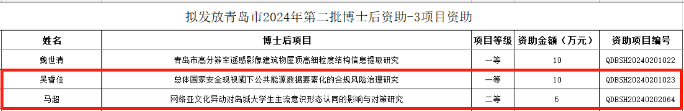 此前,米乐官网博士后吴睿佳(文法学院教师)申报的《总体国家安全观视阈下公共能源数据要素化的合规风险治理研究》和马超申报的《网络亚文化异动对岛城大学生主流意识形态认同的影响与对策研究》获批青岛市2024年第二批博士后资助项目。