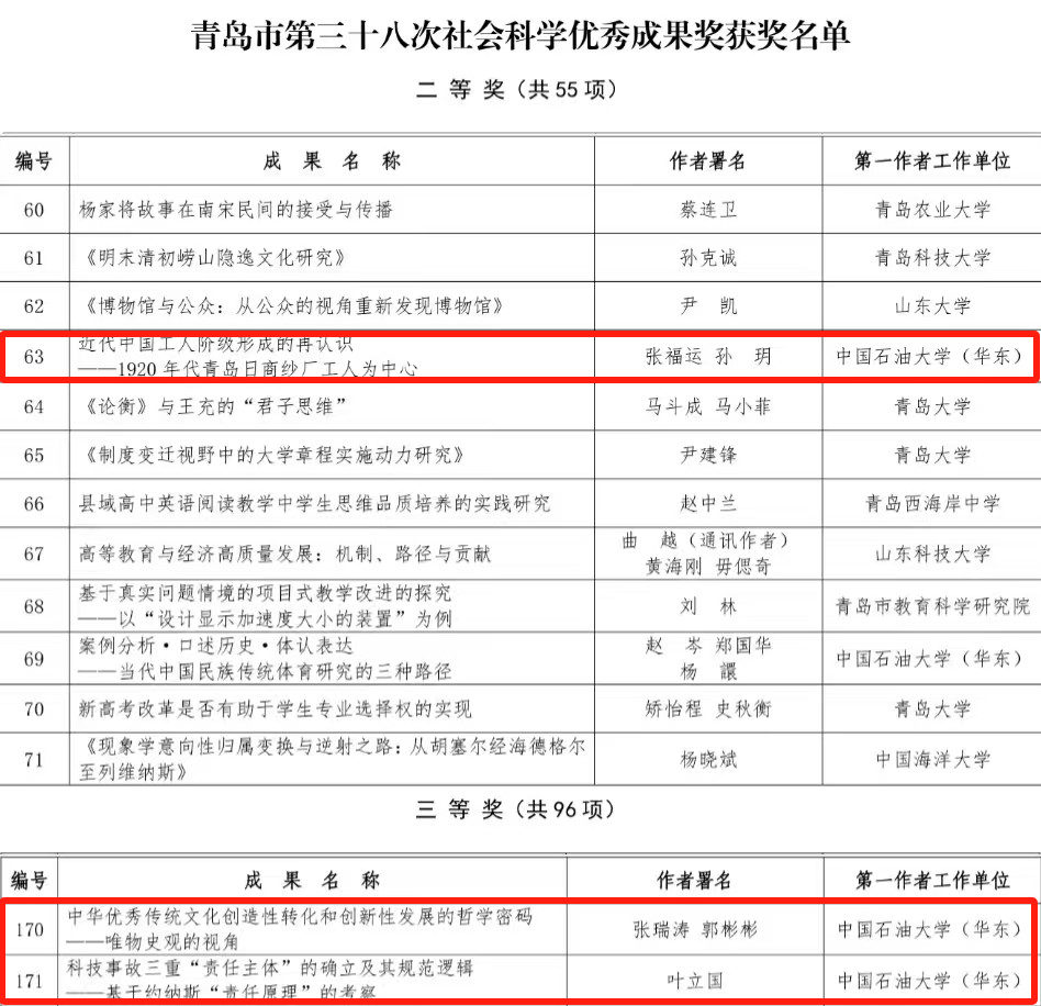 12月9日,青岛市社会科学优秀成果奖评选委员会、青岛市社会科学界联合会联合公布了青岛市第三十八次社会科学优秀成果奖获奖名单。米乐官网张福运教授的论文《近代中国工人阶级形成的再认识——1920年代青岛日商纱厂工人为中心》获二等奖;张瑞涛教授的论文《中华优秀传统文化创造性转化和创新性发展的哲学密码——唯物史观的视角》、叶立国教授的论文《科技事故三重“责任主体”的确立及其规范逻辑——基于约纳斯“责任原理”的考察》获三等奖。