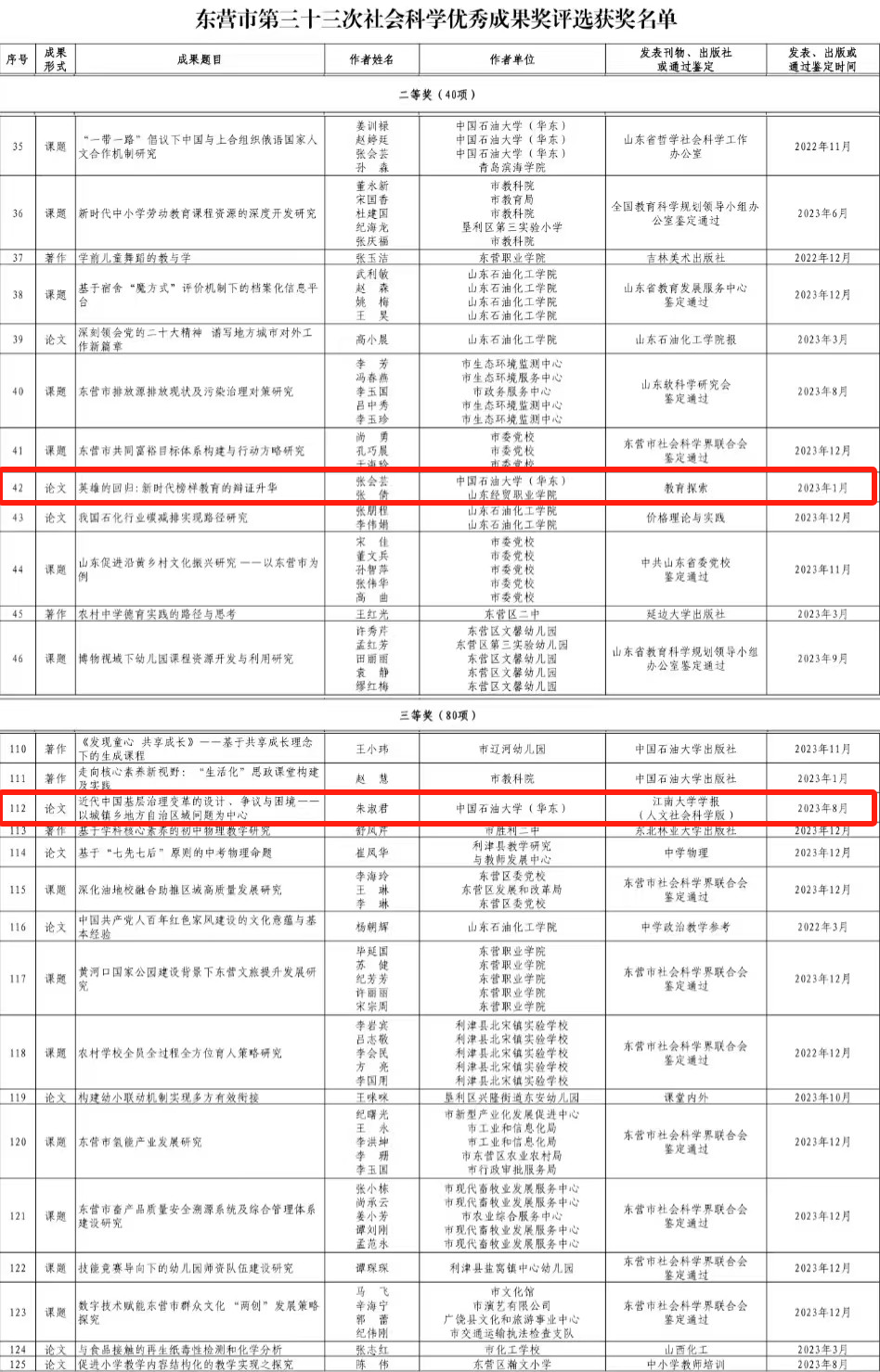 12月11日,东营市社会科学优秀成果奖评选委员会办公室公布了东营市第三十三次社会科学优秀成果奖获奖名单,米乐官网张会芸副教授的论文《英雄的回归:新时代榜样教育的辩证升华》获二等奖,朱淑君副教授的论文《近代中国基层治理变革的设计、争议与困境——以城镇乡地方自治区域问题为中心》获三等奖。