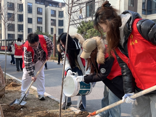 活动现场,志愿者们热情高涨、干劲十足。在专业人员的悉心指导下,研究生们身着统一的志愿服,与社区工作者组成协作小组,按照“挖坑、扶苗、培土、浇水”的标准流程进行分工合作。同学们紧握铁锹,奋力刨土,挖出一个个大小适宜、深浅合规的树坑。两名志愿者齐心协力将高大的树苗搬移至树坑中央,一人迅速上前紧紧扶住树苗主干,确保其直立不倒,其余几人则迅速回填土壤,用铁锹将土拍实,让树苗稳稳扎根。与此同时,提水浇灌的志愿者不断提着水桶往返水源,接满清水后,细致地浇灌每一棵新栽下的树苗。不到四个小时,原本裸露的空地便被一棵棵树苗覆盖。