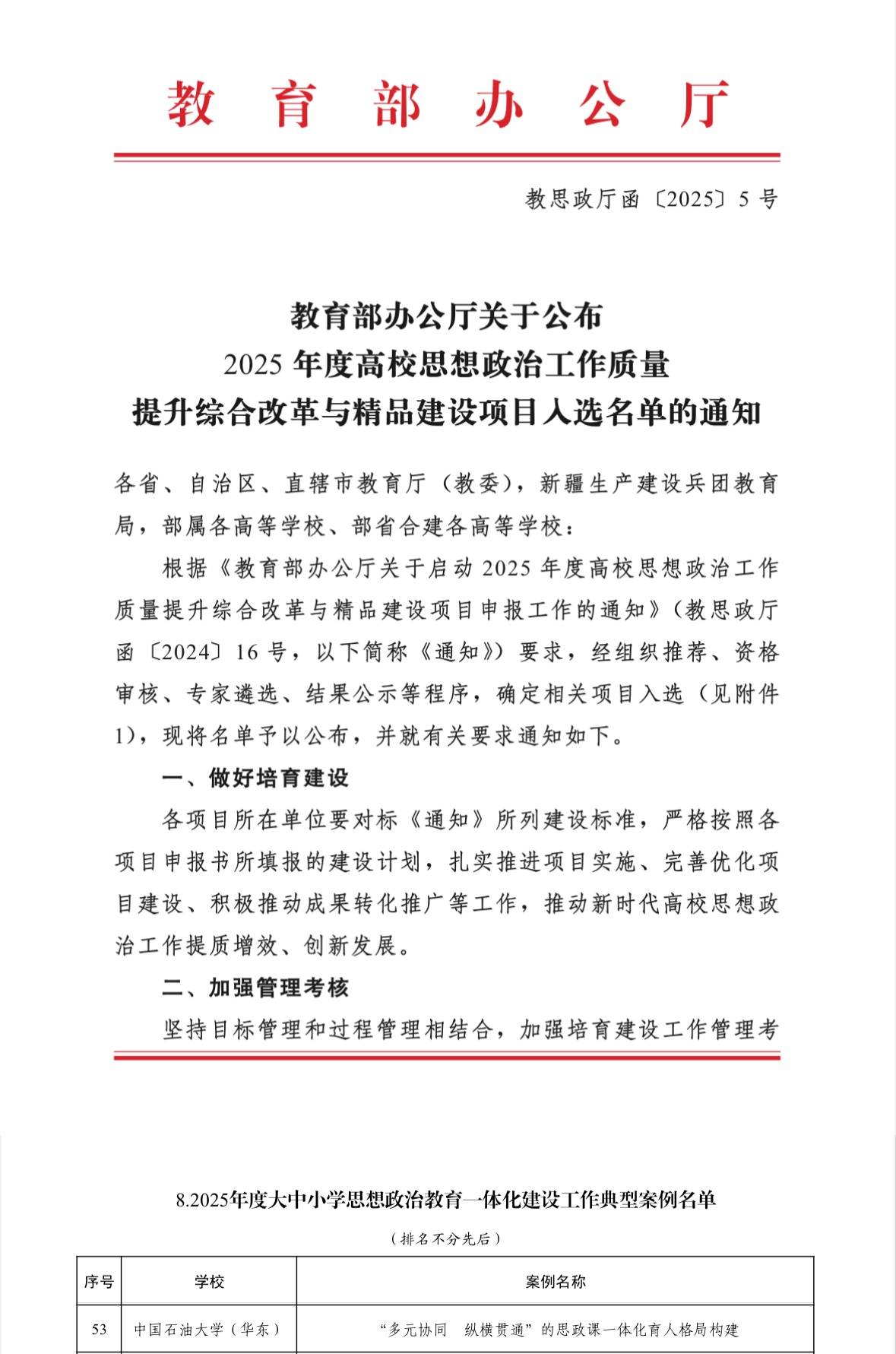 据悉,教育部高校思想政治工作质量提升综合改革与精品建设项目是全国思政领域的标志性工程,该项目着眼于“时代新人铸魂工程”提质升级,通过选树培育一批可示范、可引领、可辐射、可推广、可持续的思想政治工作品牌项目,着力推进各高校建设高质量思想政治工作体系、构筑立德树人新格局,为实施新时代立德树人工程提供有力支撑。