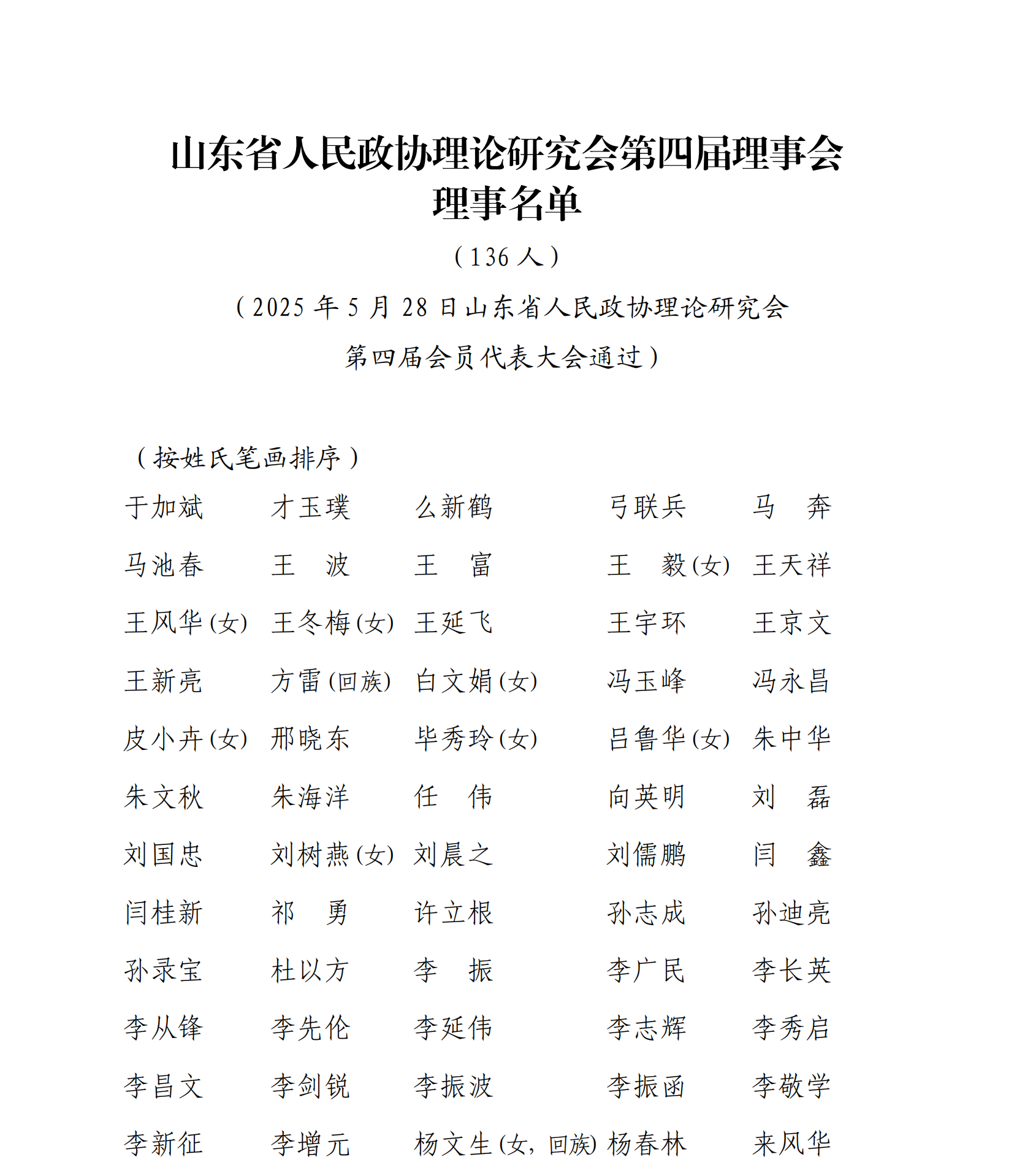 5月28日,山东省人民政协理论研究会第四届会员代表大会和第四届理事会第一次会议在济南召开。会议传达了中国人民政协理论研究会有关会议精神,审议通过了第三届理事会工作报告和新修订的研究会章程,选举产生了第四届理事会会长、副会长、秘书长、常务理事、理事。